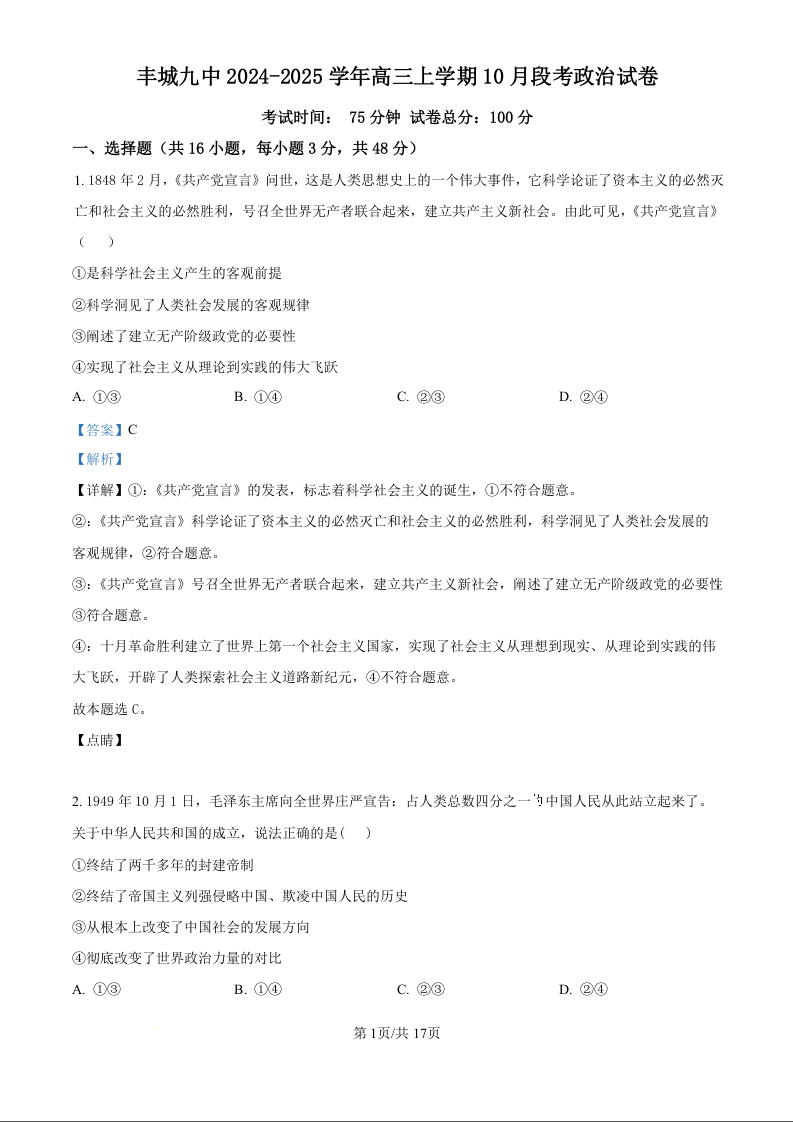 江西省宜春市丰城市第九中学2024-2025学年高三上学期第一次段考政治答案
