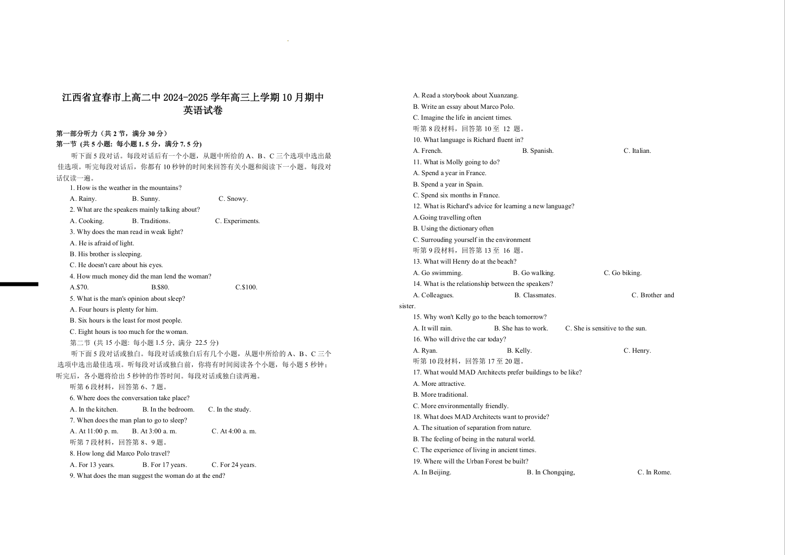江西省宜春市上高二中2025届高三上学期10月期中考试英语+答案