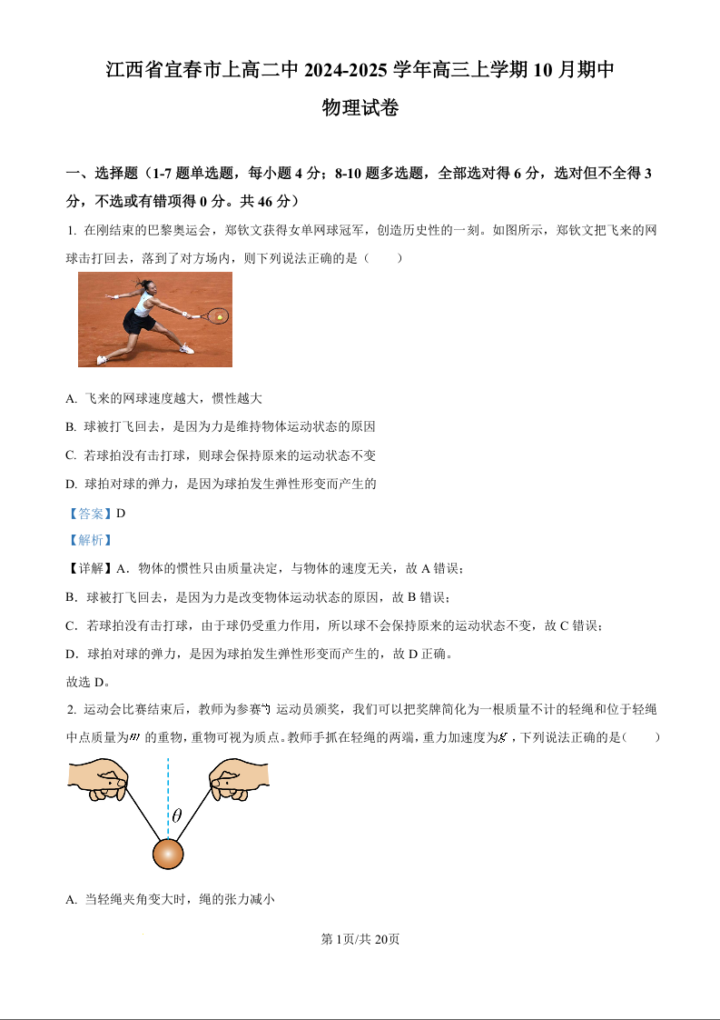 江西省宜春市上高二中2025届高三上学期10月期中考试物理(解析版)