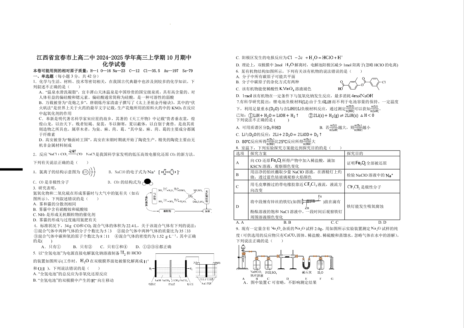 江西省宜春市上高二中2025届高三上学期10月期中考试化学+答案