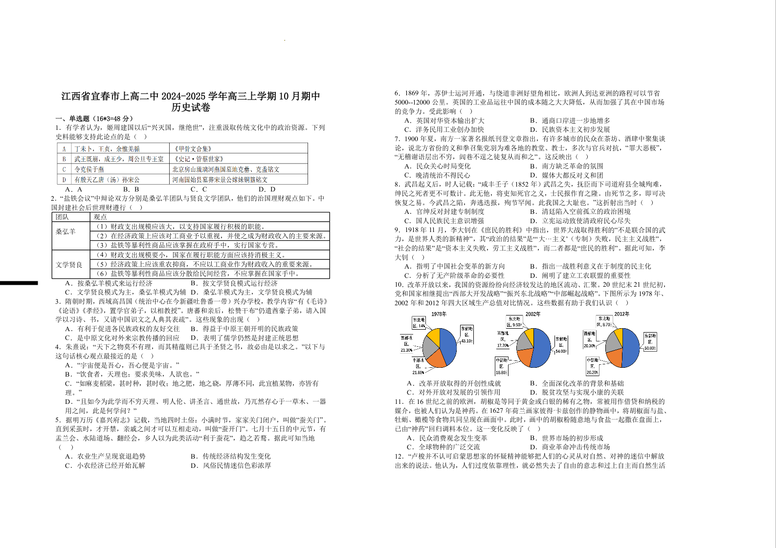 江西省宜春市上高二中2025届高三上学期10月期中考试历史+答案