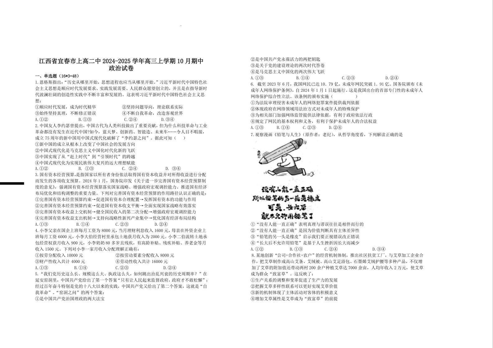 江西省宜春市上高二中2025届高三上学期10月期中考试政治+答案