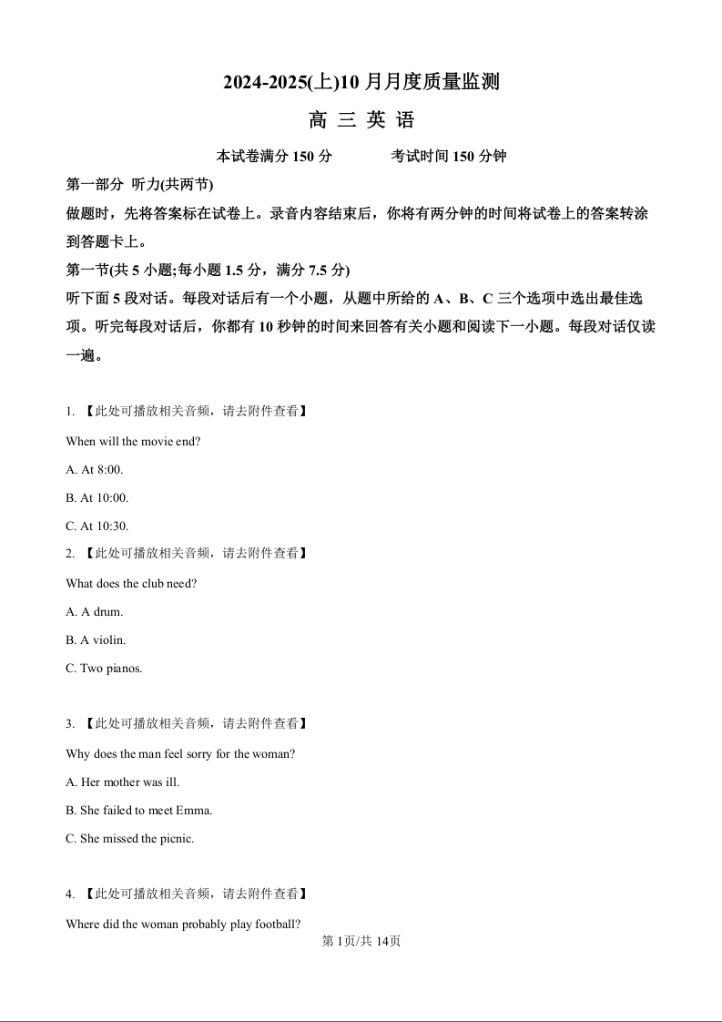 辽宁省部分高中2025届高三上学期10月月考英语试题(原卷版)