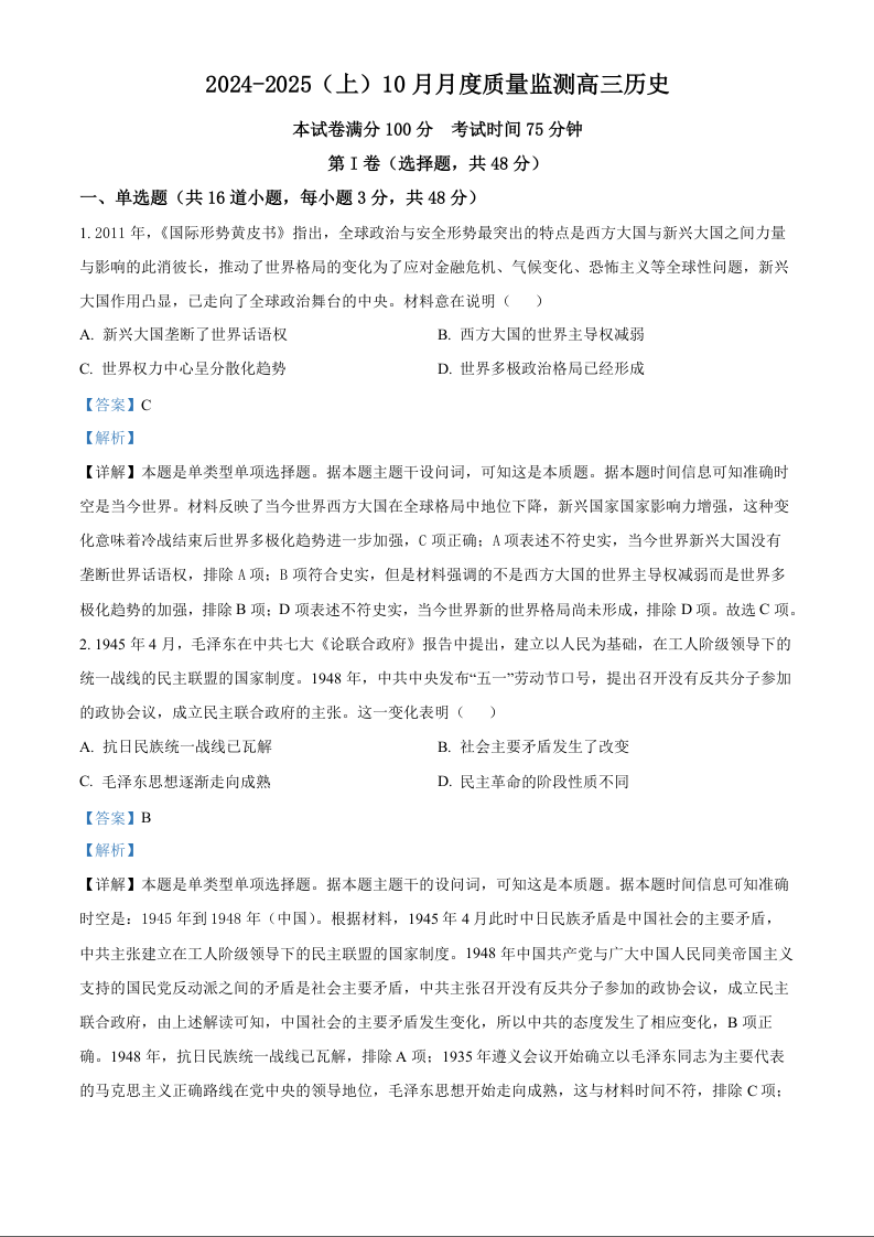 辽宁省部分高中2025届高三上学期10月月考历史试题+答案