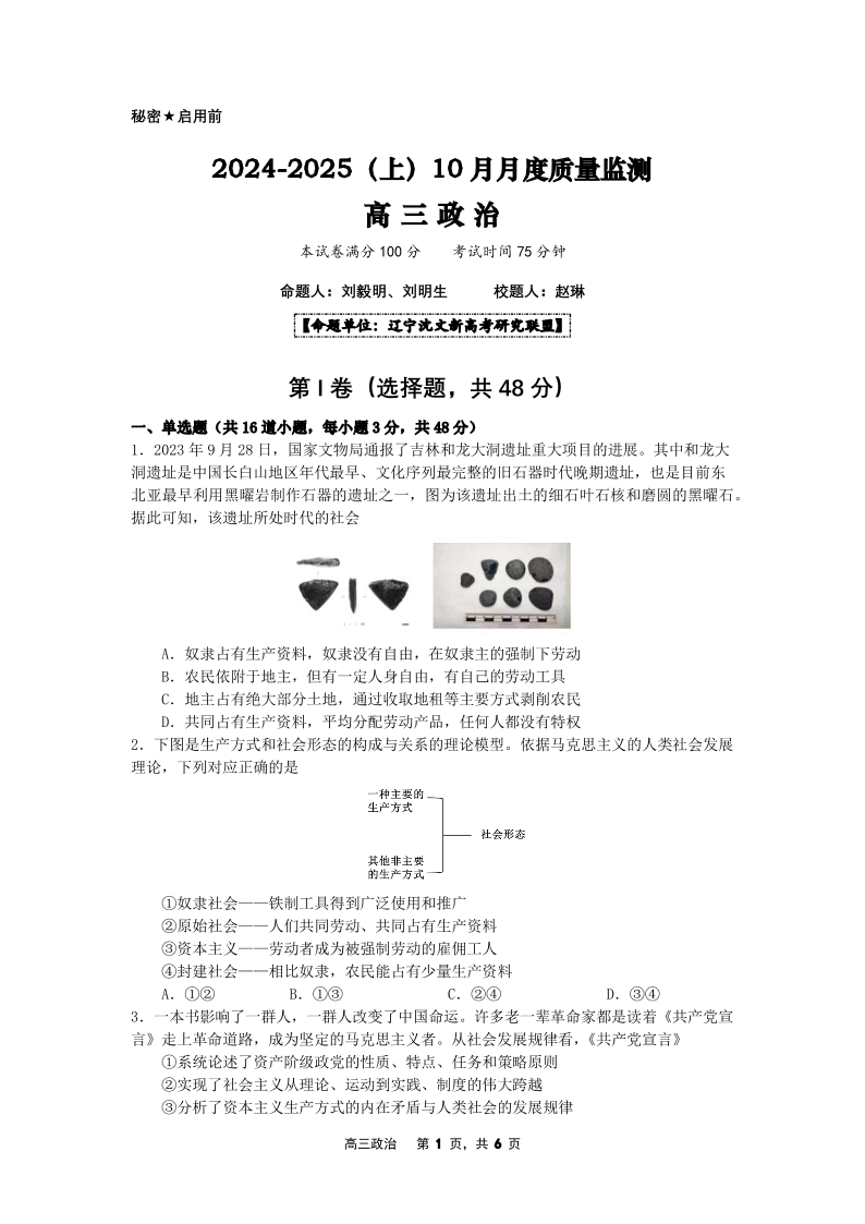 辽宁省部分高中2025届高三上学期10月月考政治