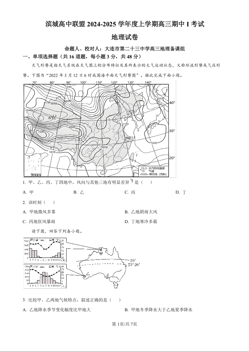 辽宁省大连市滨城高中联盟2025届高三上学期期中考试地理试题(原卷版)