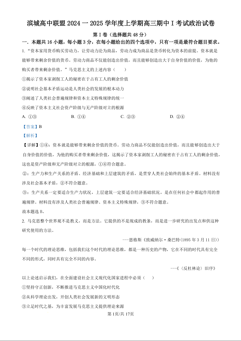 辽宁省大连市滨城高中联盟2025届高三上学期期中考试(解析版)