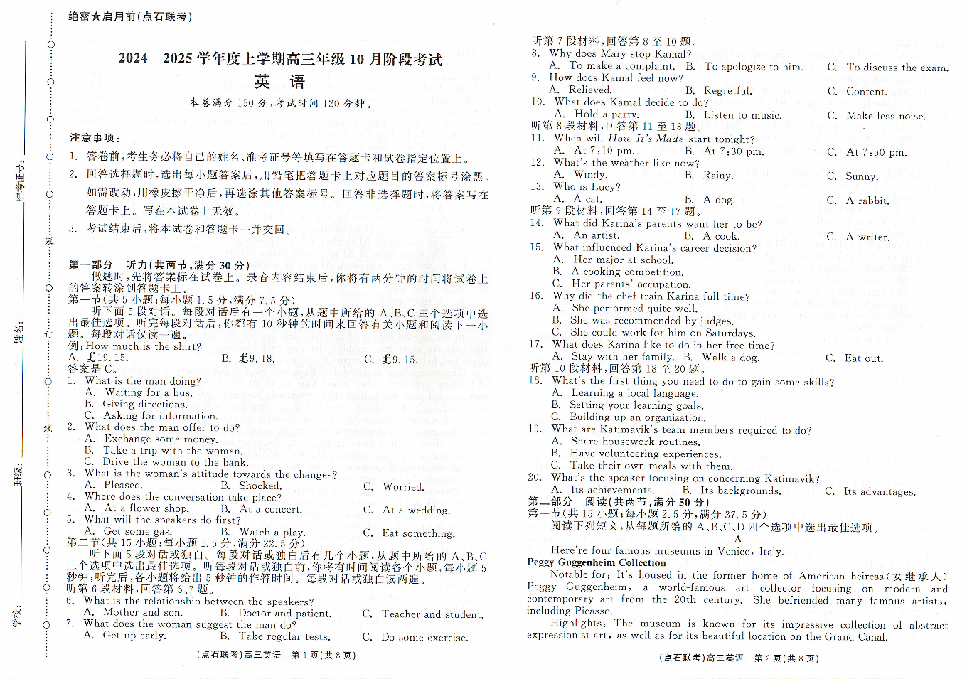 辽宁省点石联考2024-2025学年度高三上学期年级10月阶段考试英语试题