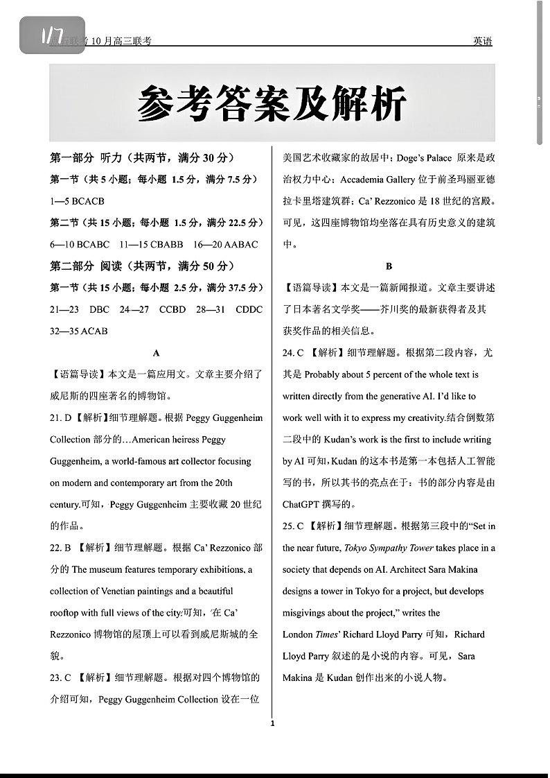 辽宁省点石联考2024-2025学年度高三上学期年级10月阶段考试英语参考答案及解析