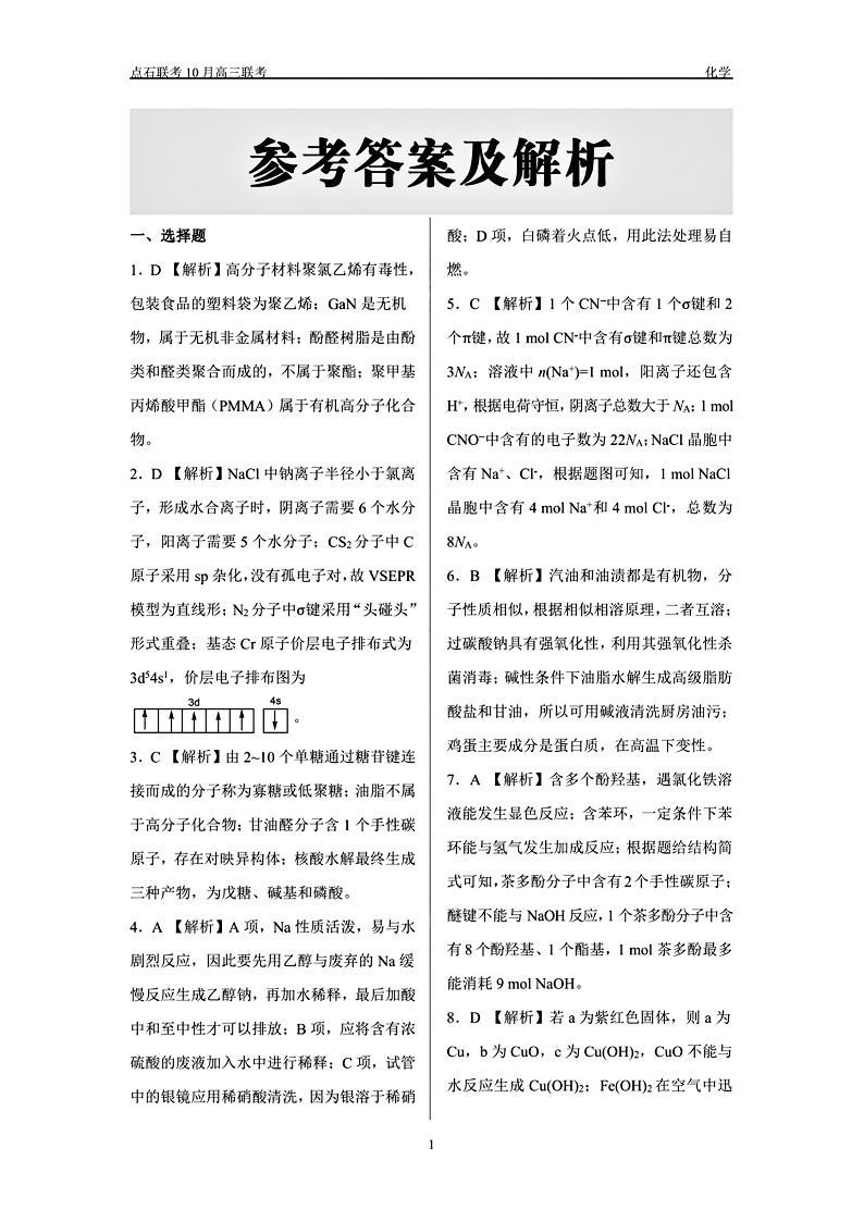 辽宁省点石联考2024-2025学年度高三上学期年级10月阶段考试化学试题答案