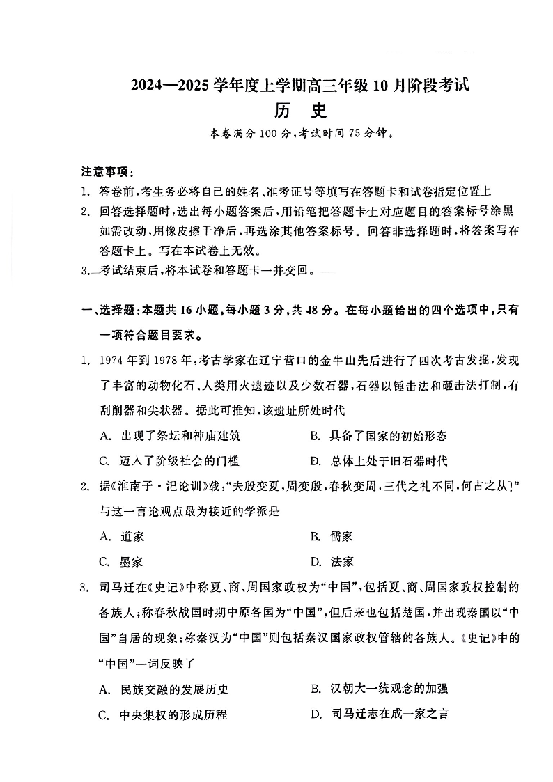 辽宁省点石联考2024-2025学年度高三上学期年级10月阶段考试历史试题