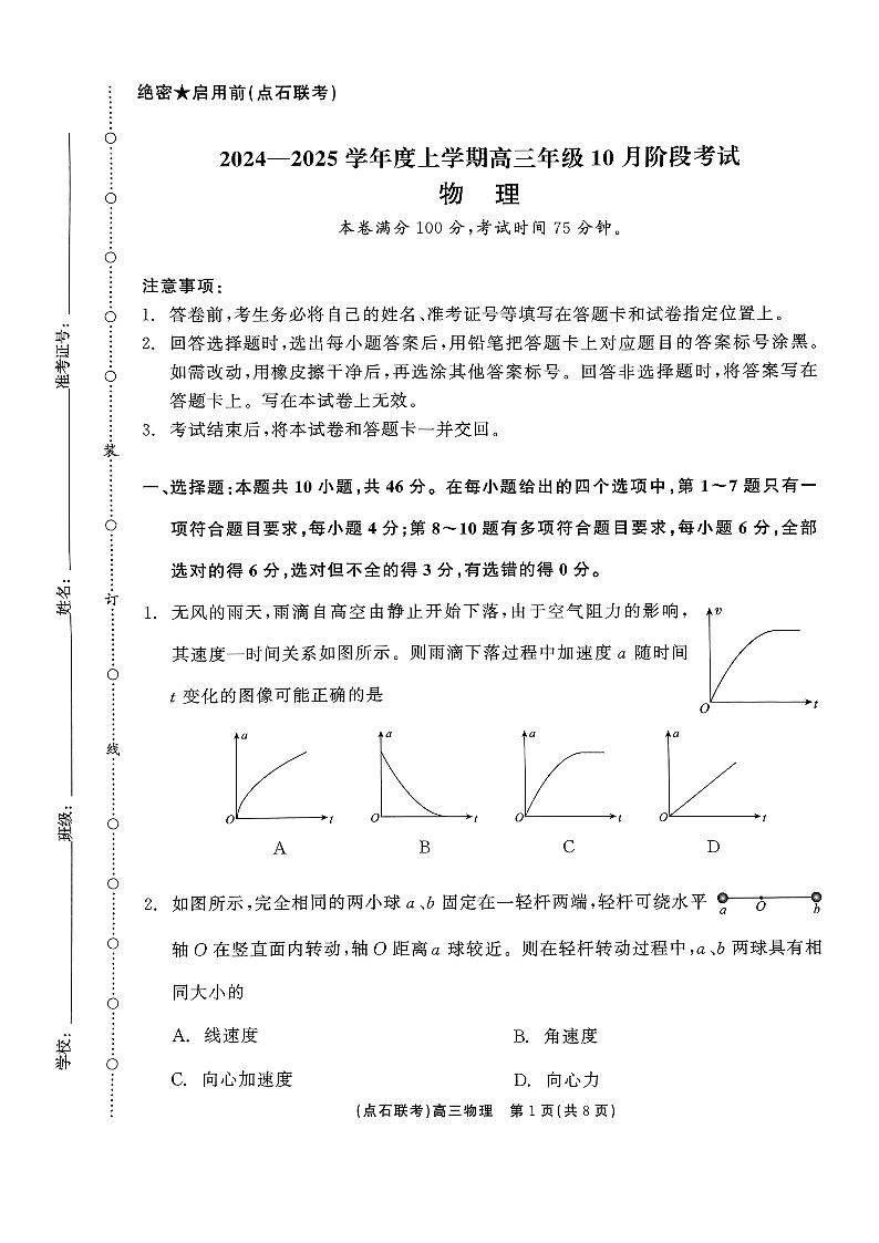 辽宁省点石联考2024-2025学年度高三上学期年级10月阶段考试物理试题