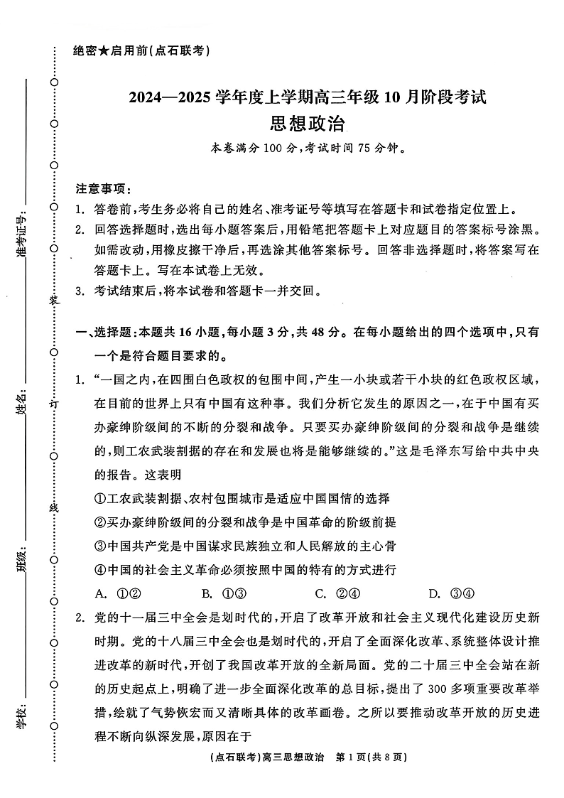 辽宁省点石联考2024-2025学年度高三上学期年级10月阶段考试政治试题