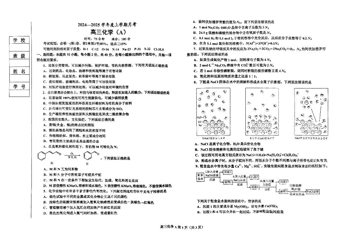 辽宁省辽东南协作体2025届高三上学期10月月考化学+答案