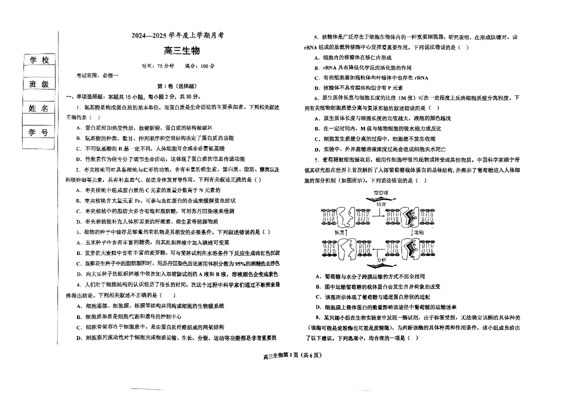 辽宁省辽东南协作体2025届高三上学期10月月考生物+答案