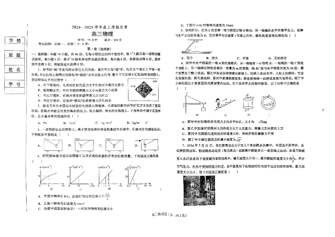辽宁省辽东南协作体2025届高三上学期10月月考物理+答案