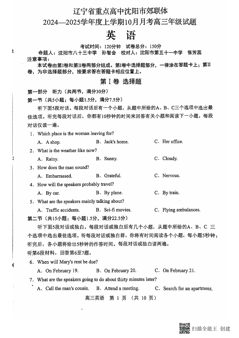 辽宁省重点高中沈阳市郊联体2025届高三上学期10月月考英语+答案