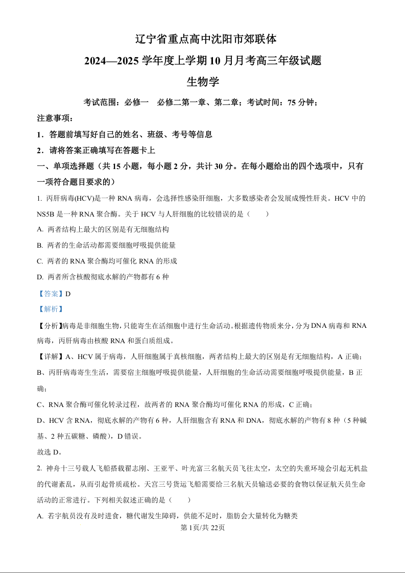 辽宁省重点高中沈阳市郊联体2025届高三上学期10月月考生物试题(解析版)