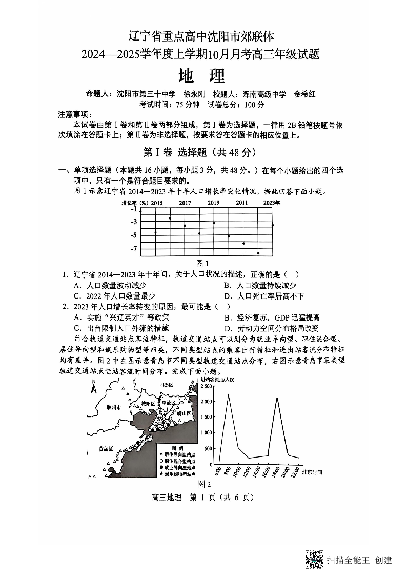 辽宁省重点高中沈阳市郊联体2025届高三上学期10月月考地理+答案