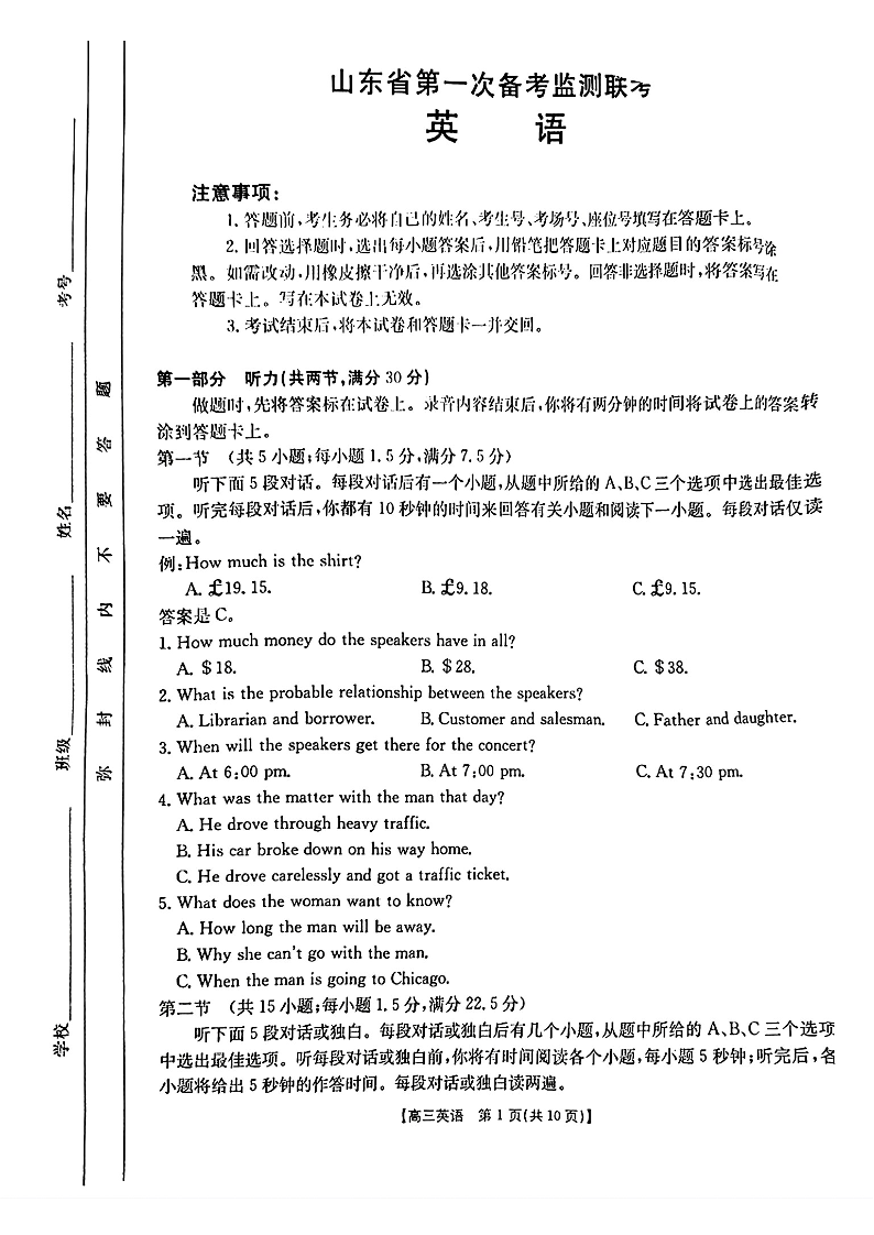 山东省2025届高三上学期第一次备考监测联考英语+答案