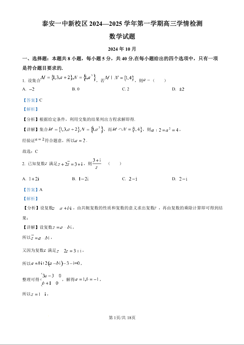 山东省泰安第一中学新校区2024-2025学年高三教学质量检测数学试题(解析版)