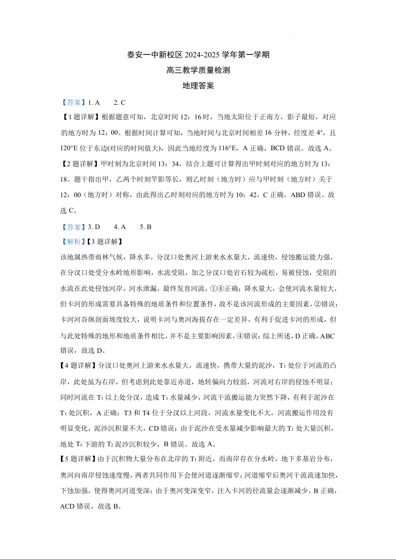 山东省泰安第一中学新校区2024-2025学年高三教学质量检测地理答案