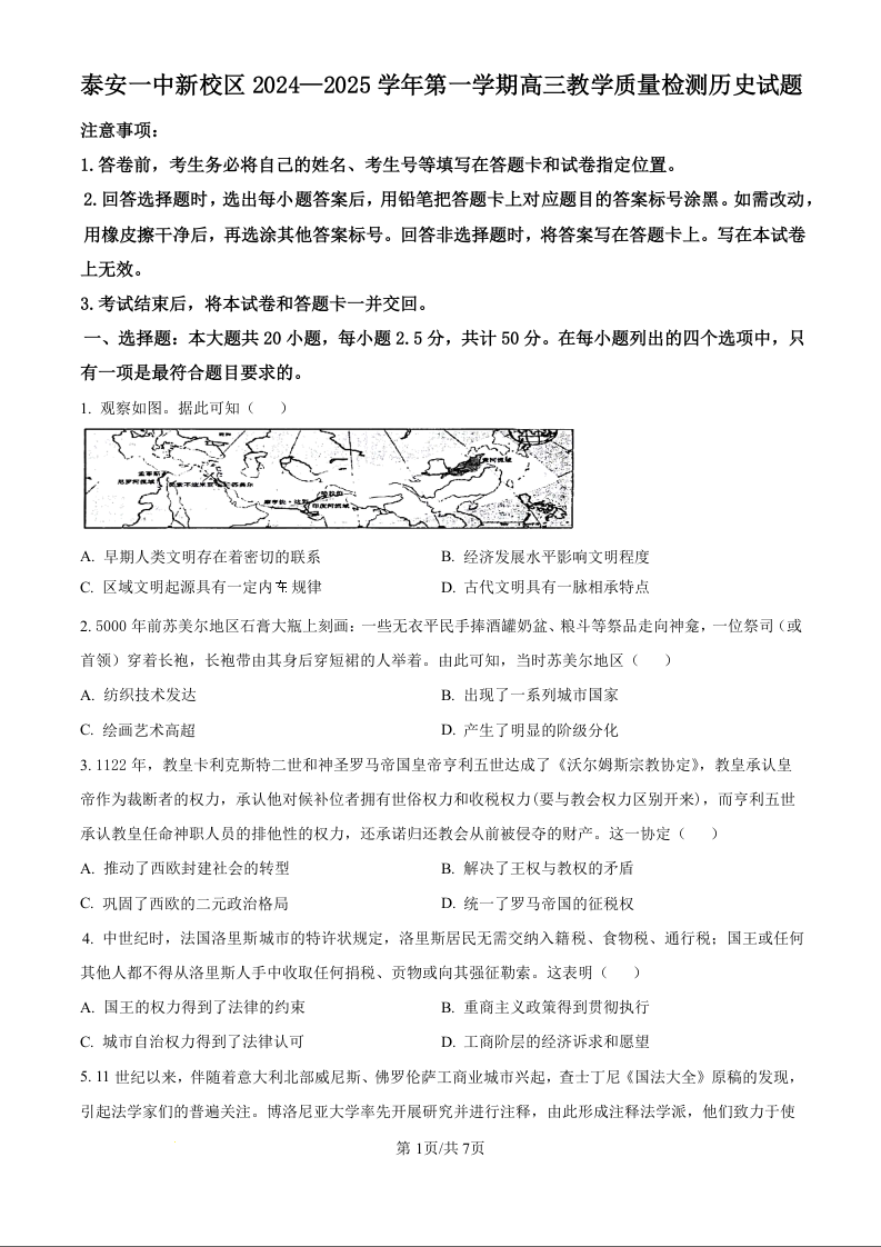山东省泰安第一中学新校区2024-2025学年高三教学质量检测历史试题(原卷版)