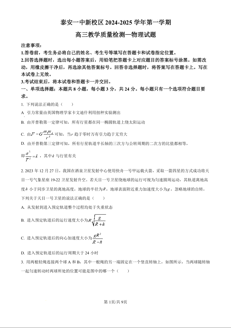 山东省泰安第一中学新校区2024-2025学年高三教学质量检测物理试题(原卷版)