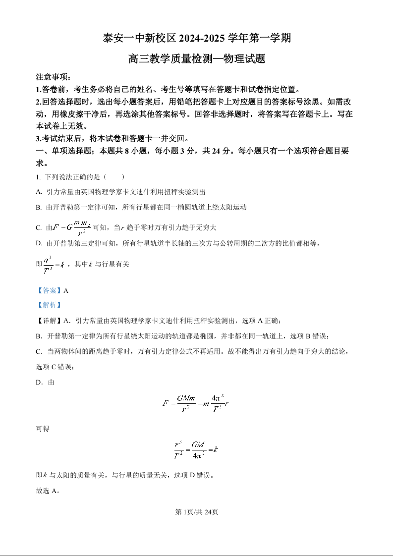 山东省泰安第一中学新校区2024-2025学年高三教学质量检测物理试题(解析版)