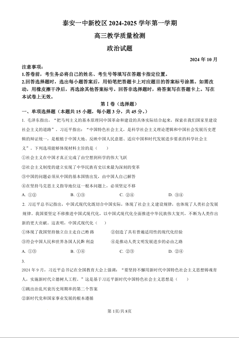 山东省泰安第一中学新校区2024-2025学年高三教学质量检测政治试题(原卷版)