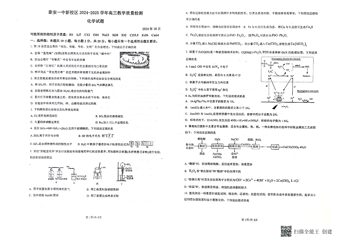 山东省泰安第一中学新校区2024-2025学年高三教学质量检测化学