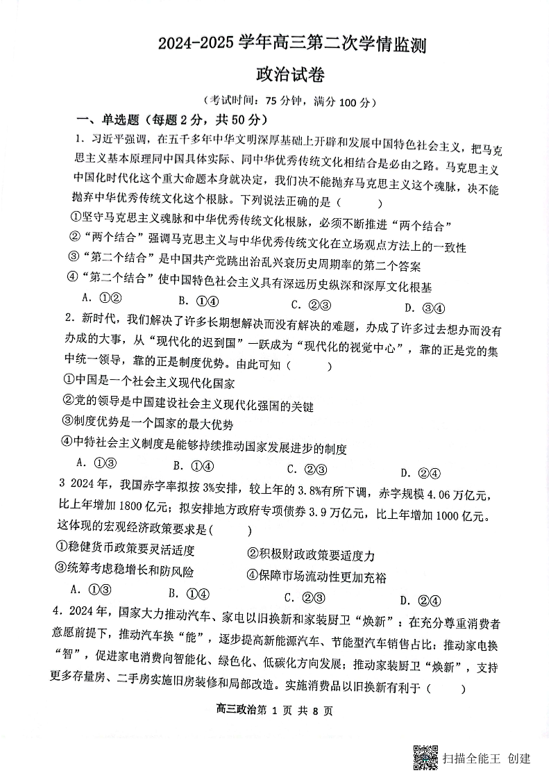 山西省大同市第一中学校2025届高三上学期9月月考政治