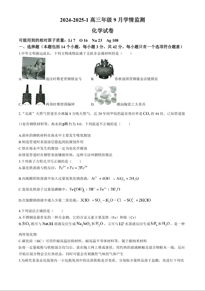 山西省大同市第一中学校2025届高三上学期9月月考化学