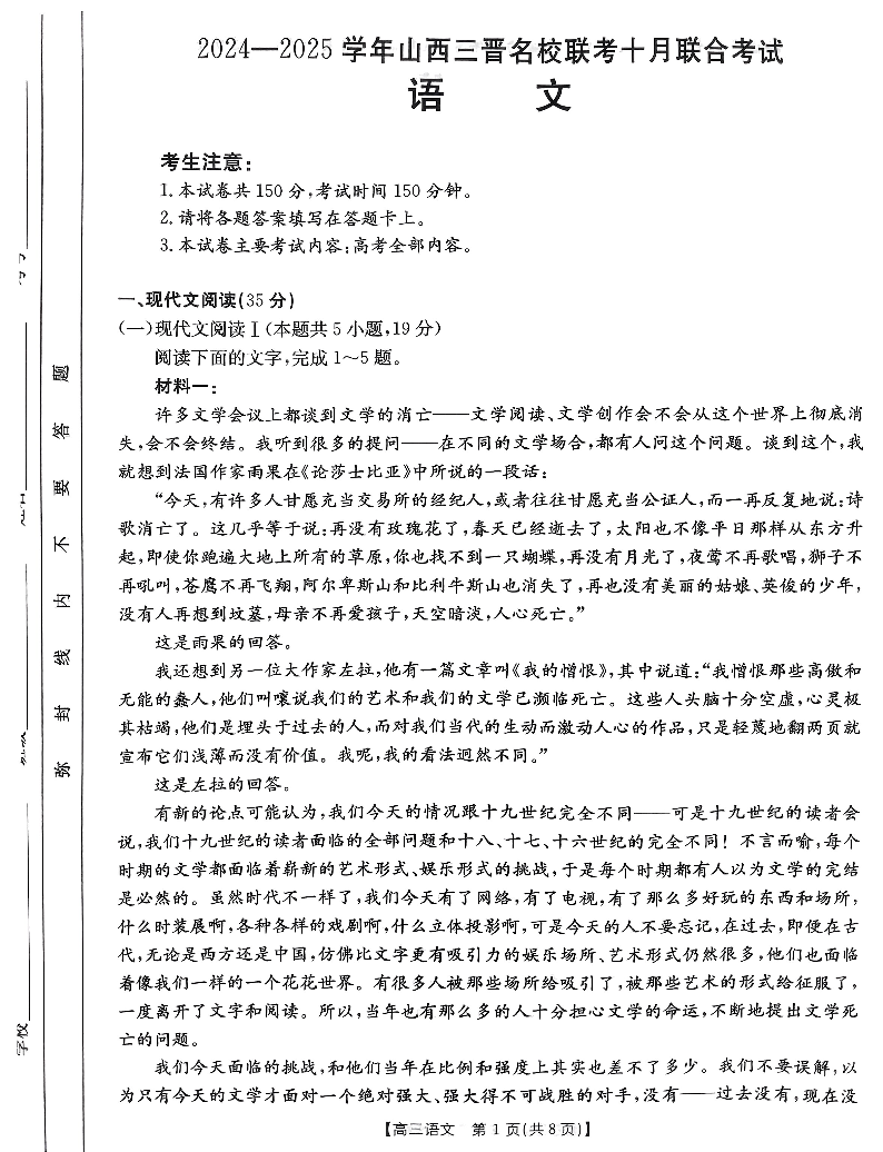 山西省2024-2025学年三晋名校联考10月联合考试语文+答案