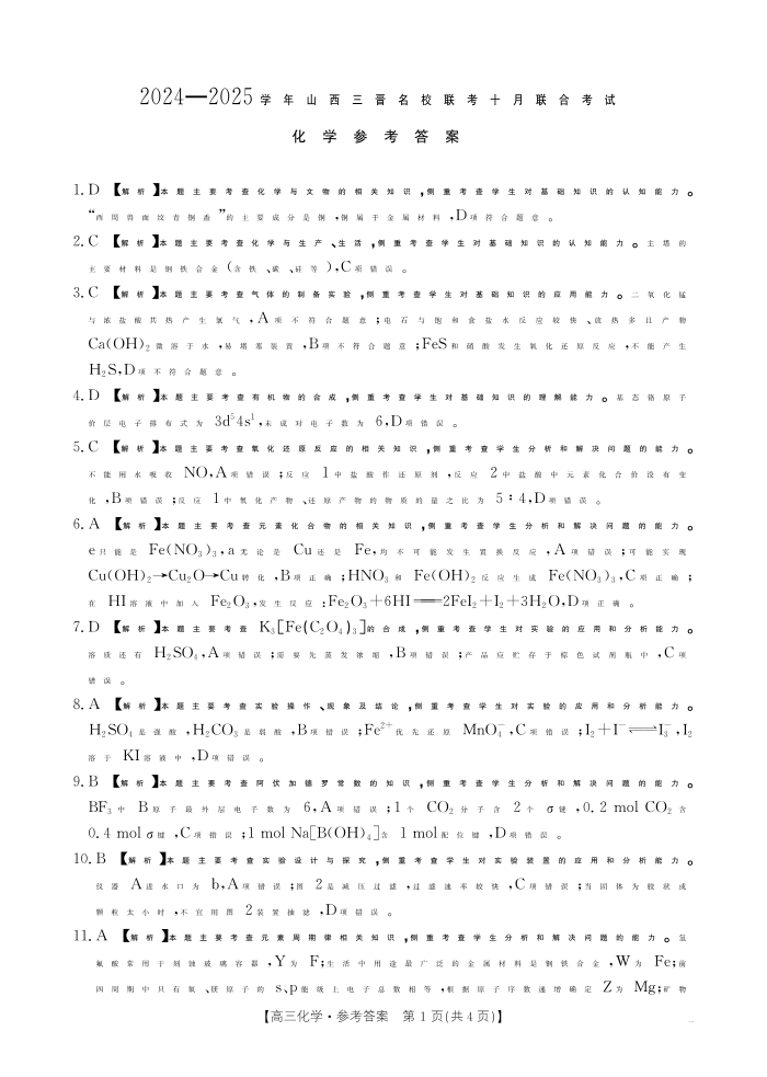 山西省2024-2025学年三晋名校联考10月联合考试化学答案