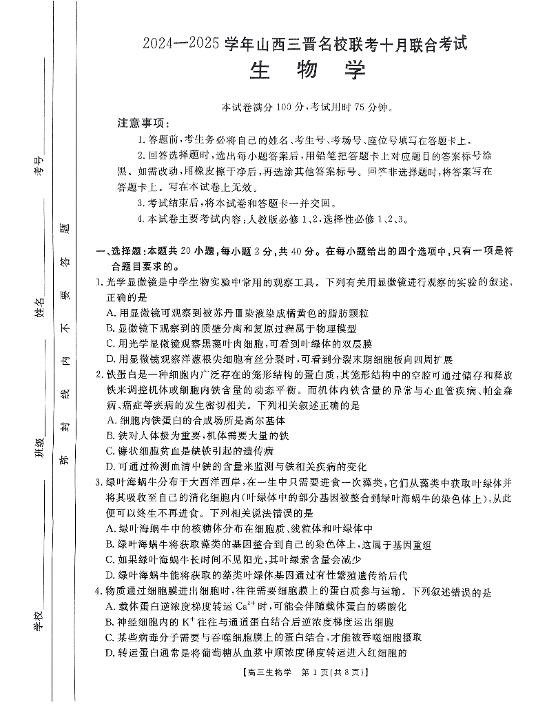 山西省2024-2025学年三晋名校联考10月联合考试生物