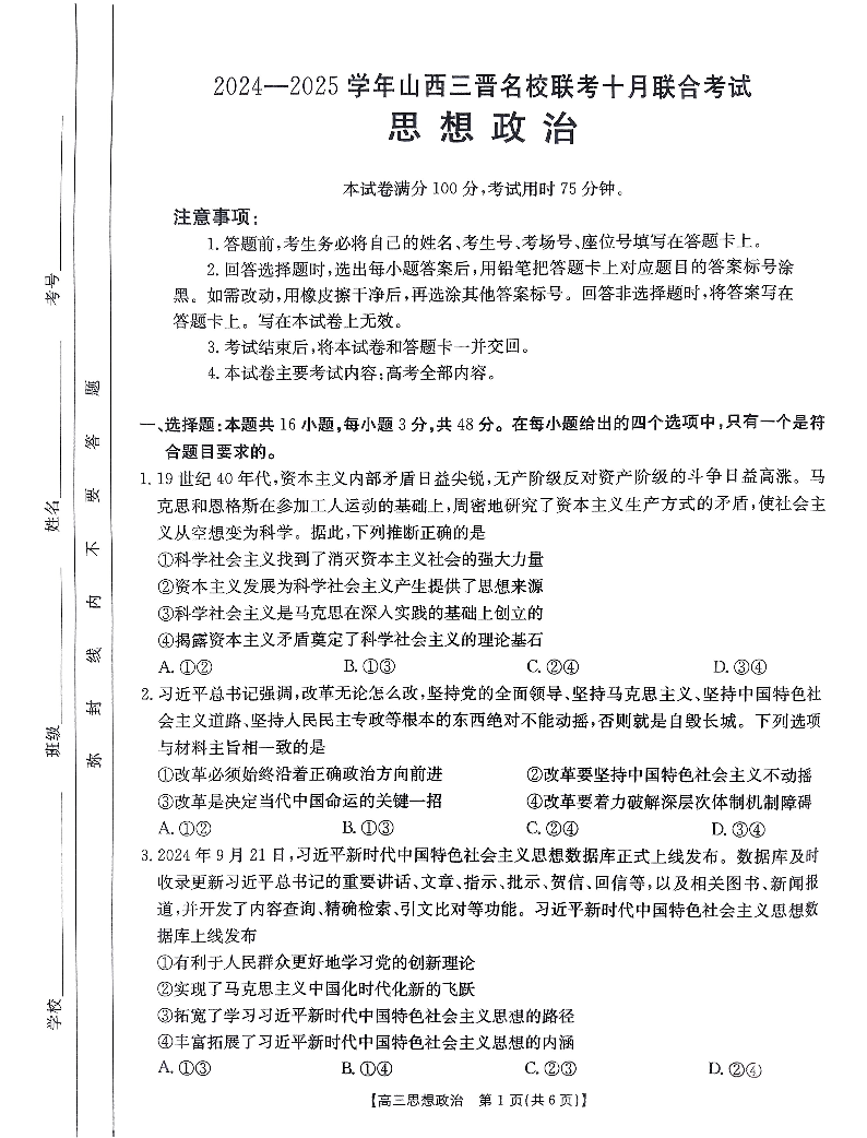 山西省2024-2025学年三晋名校联考10月联合考试政治