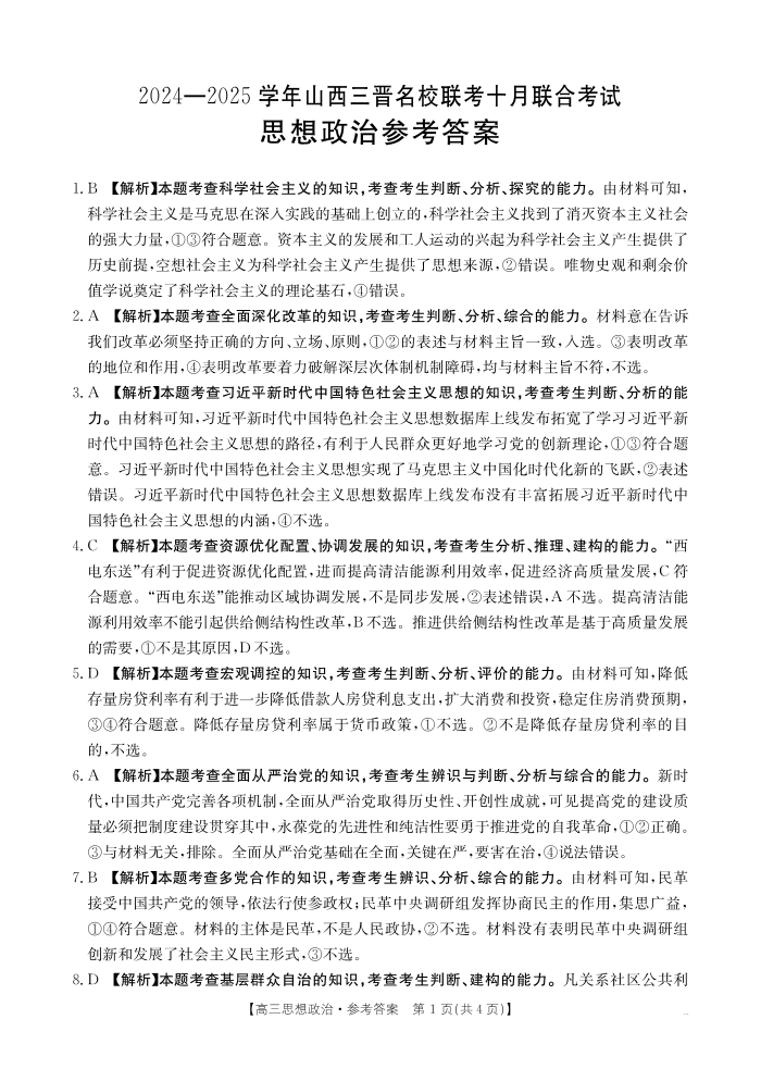 山西省2024-2025学年三晋名校联考10月联合考试政治答案