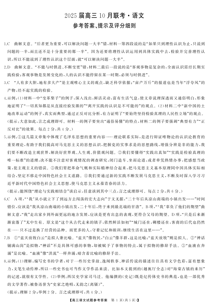 山西省长治市2025届高三上学期10月联考语文答案