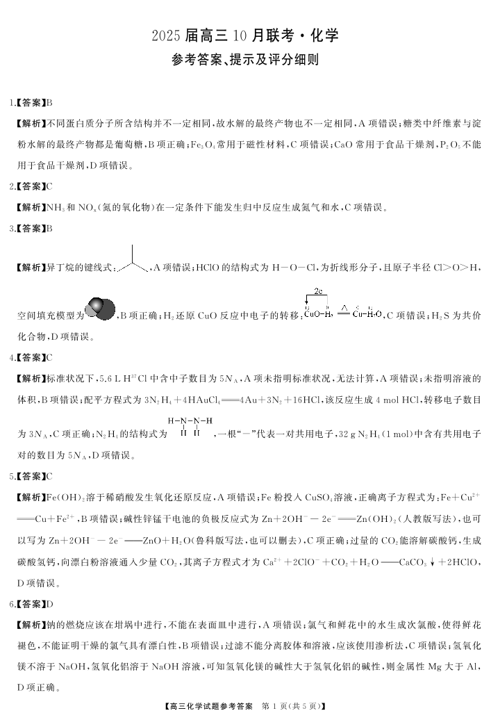 山西省长治市2025届高三上学期10月联考化学答案