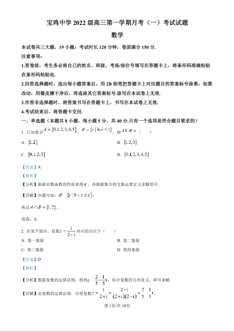 陕西省宝鸡中学2022级高三第一学期月考(一)数学试题(解析版)