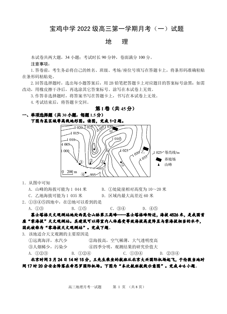陕西省宝鸡中学2022级高三第一学期月考(一)地理