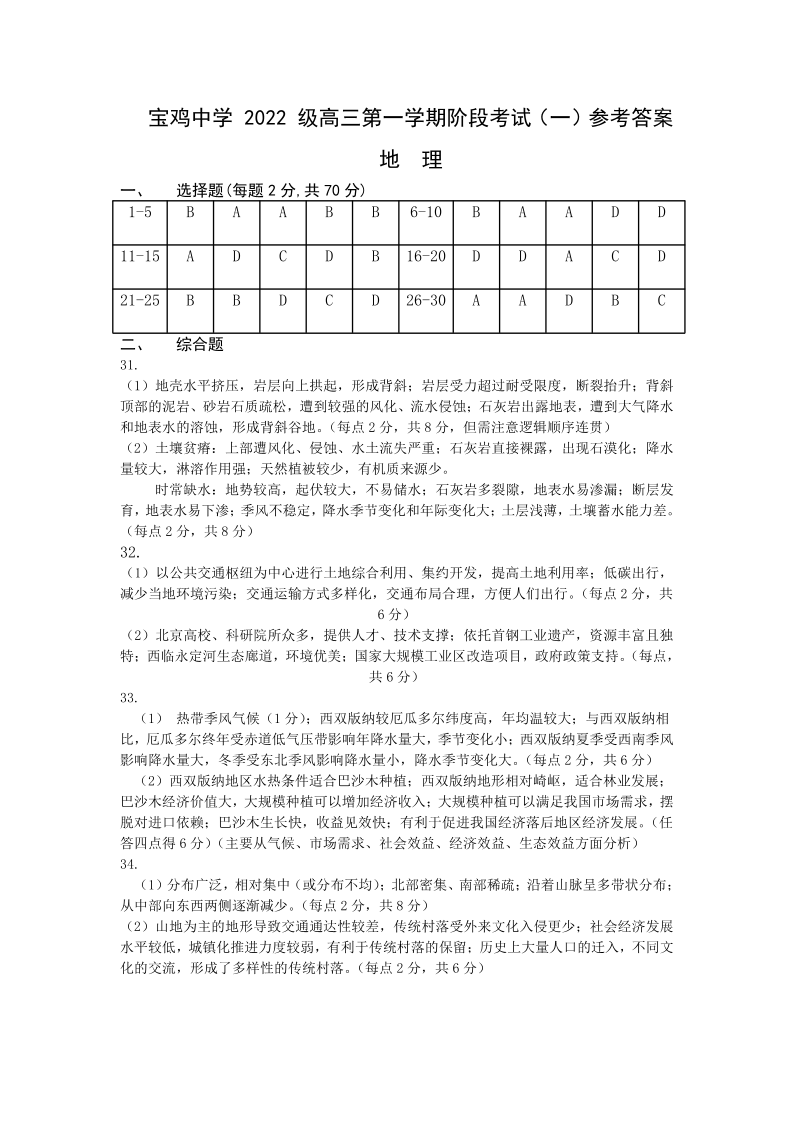 陕西省宝鸡中学2022级高三第一学期月考(一)地理答案