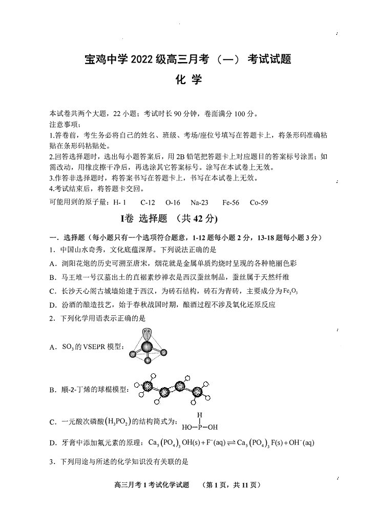 陕西省宝鸡中学2022级高三第一学期月考(一)化学