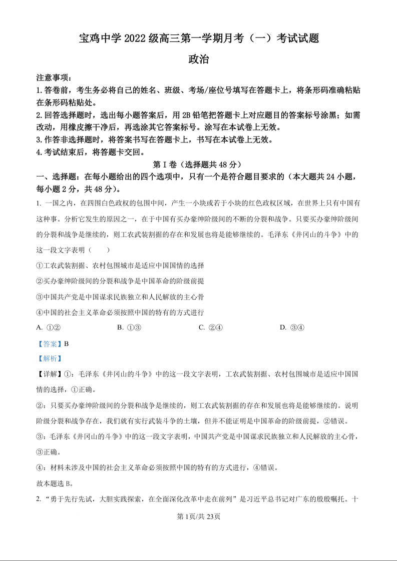 陕西省宝鸡中学2022级高三第一学期月考(一)政治试题(解析版)