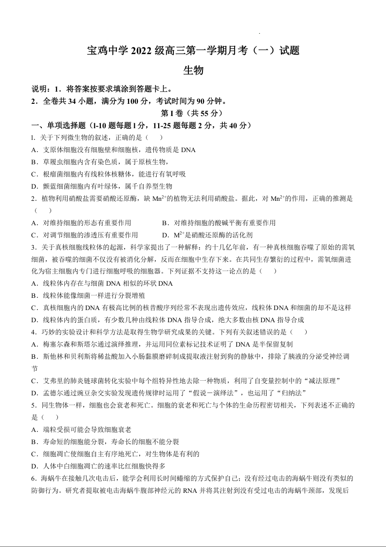 陕西省宝鸡中学2022级高三第一学期月考(一)生物+答案