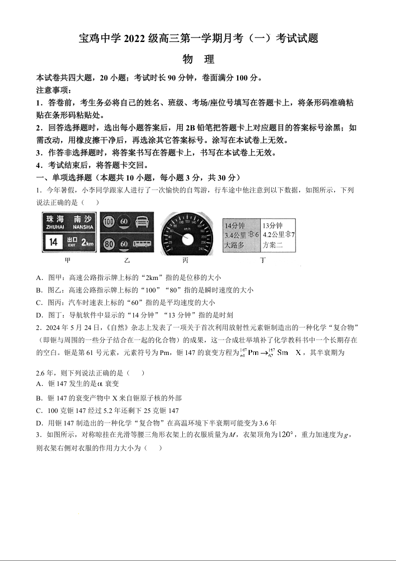 陕西省宝鸡中学2022级高三第一学期月考(一)物理+答案