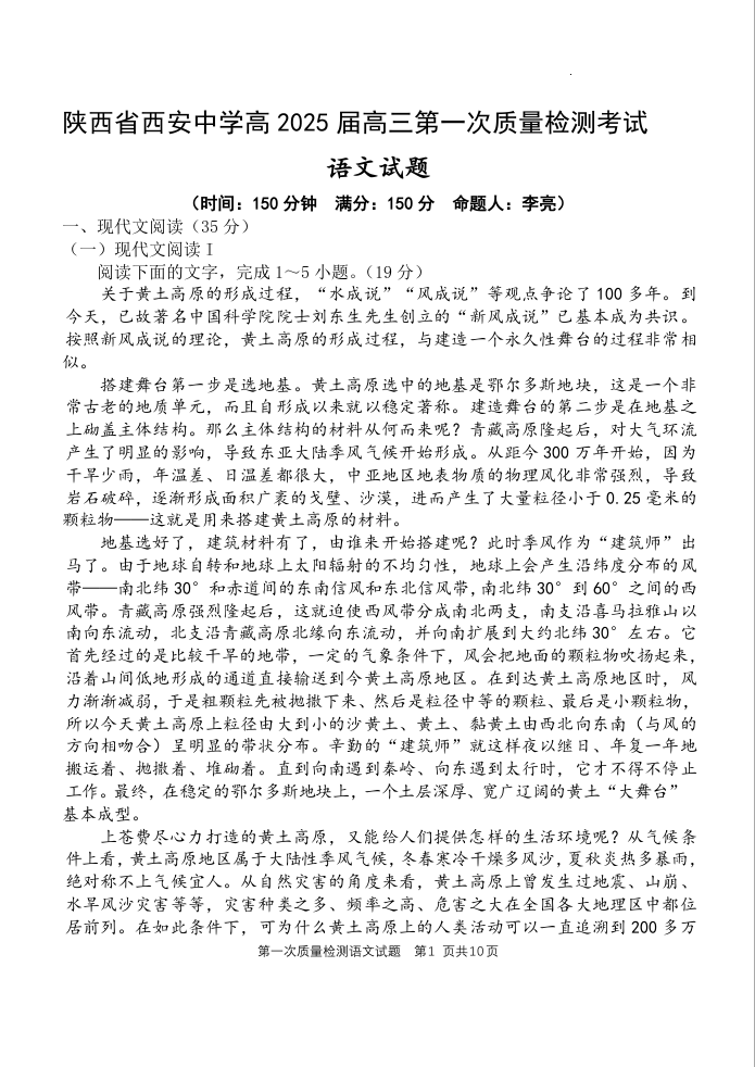 陕西省西安中学高2025届高三第一次质量检测考试语文