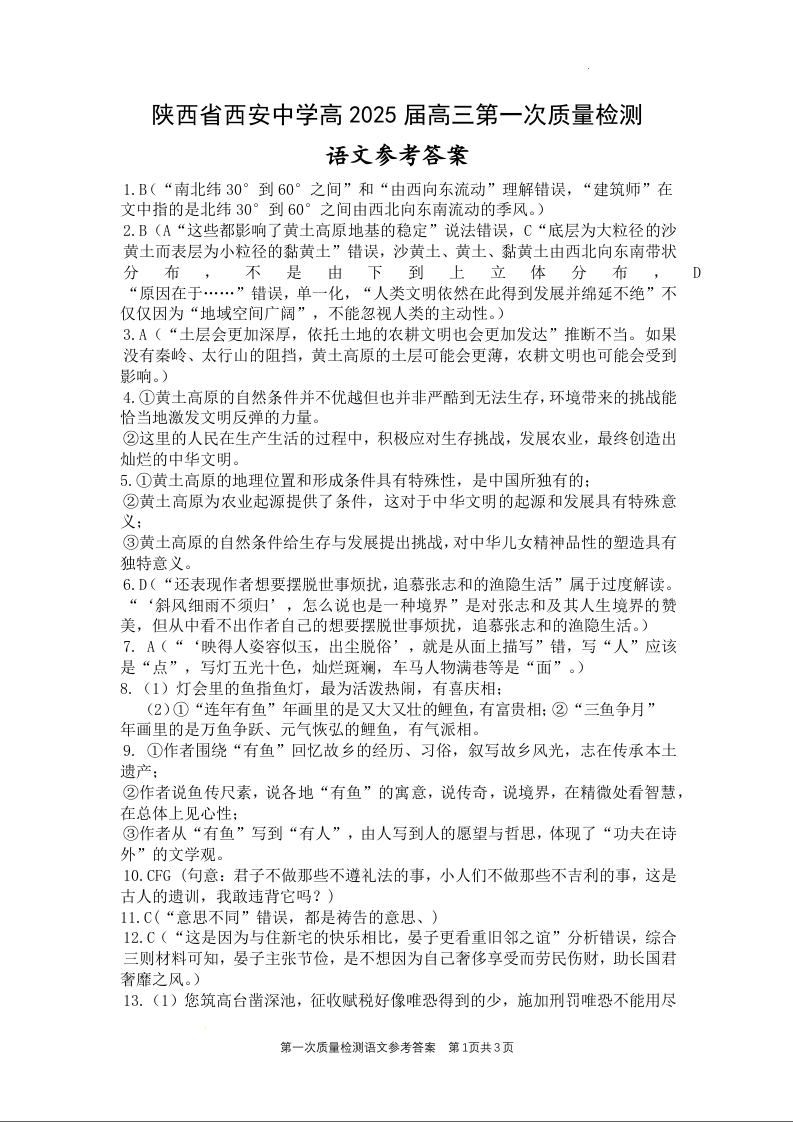 陕西省西安中学高2025届高三第一次质量检测考试语文答案