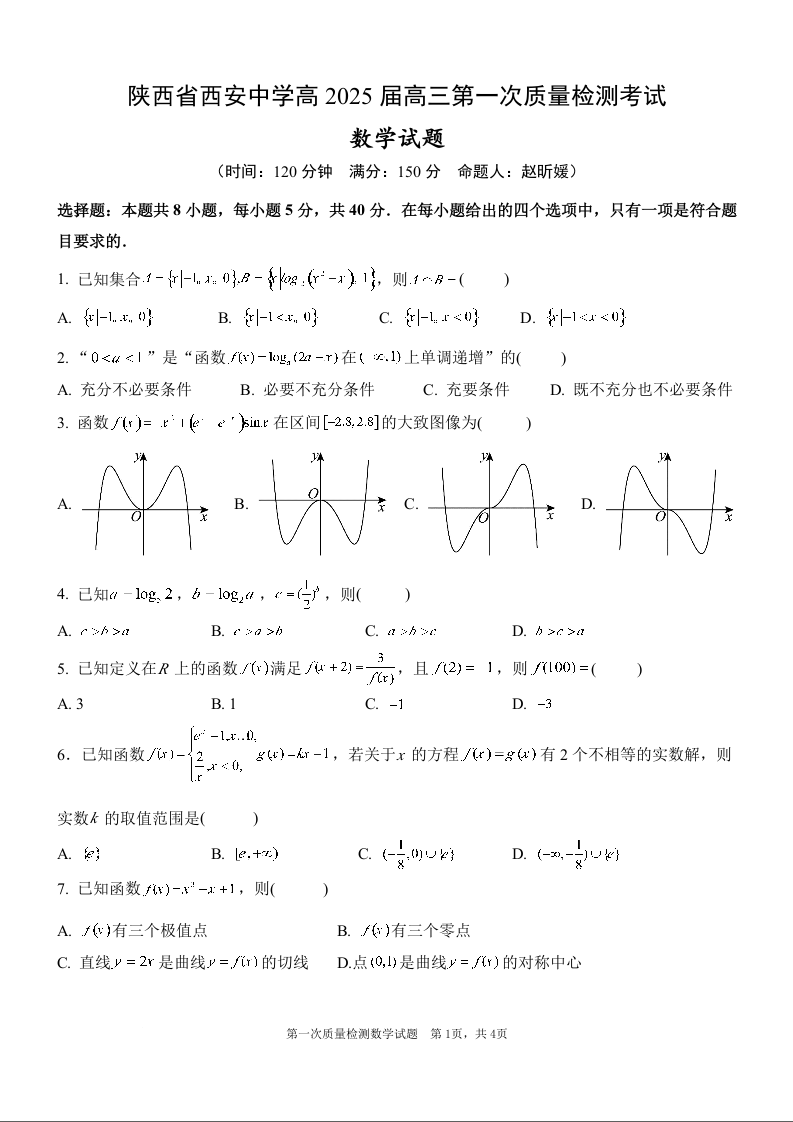 陕西省西安中学高2025届高三第一次质量检测考试数学
